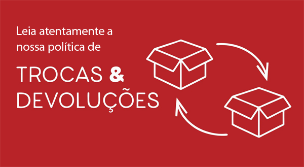 Prazos para trocas ou devolução: 07 dias corridos a partir do recebimento do pedido. Solicitações realizadas após o decurso deste prazo não serão aceitas.